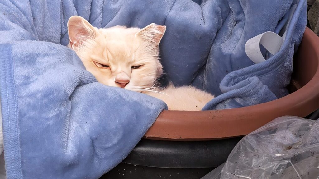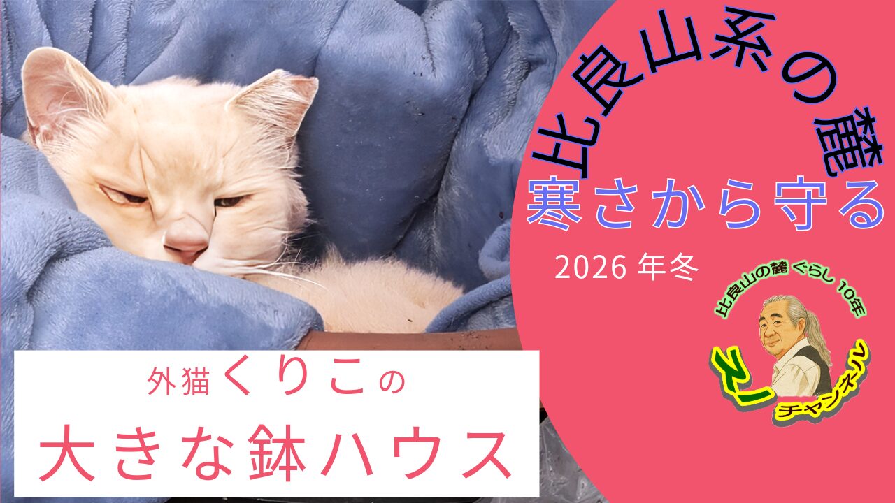 クリ子はんは、秋頃から菜園の物置に置かれた大きなプラスチック製の鉢で寝ることがあった。はじめこの鉢には、菜園にすき込もうと考えて枯れ葉が沢山入れてあった。秋口からクリ子はんが体中に枯れ葉を付けてウッドデッキに来るようになった。「どうしたんこんなに葉っぱ付けて」と妻と私は言っていた。ある時、菜園で作業していると鉢の中でクリ子はんが「ニャー」と鳴いた。それでこの鉢が、クリ子はんの寝床になっていることが判ったのだった。