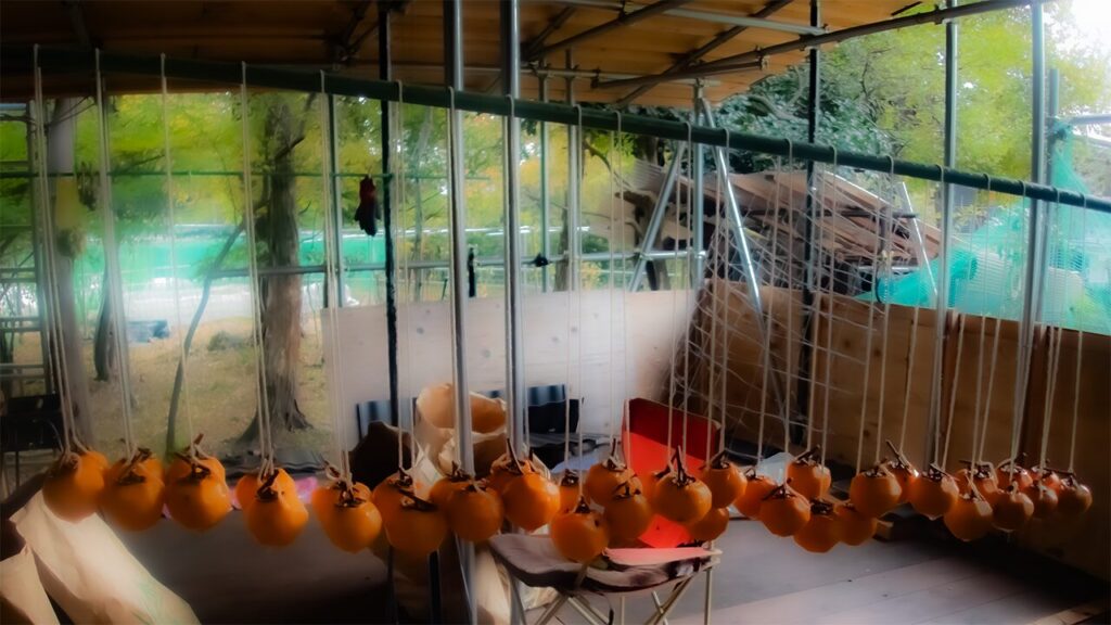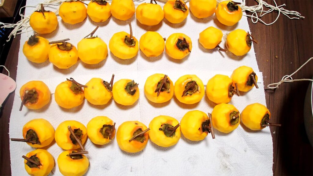 11月の下旬、こちらに来ていた妻が言った「あの柿食べられへんのー」庭に野生の柿の木がある。毎年たわわに実のり、サルやヒヨドリが食べに来る。その後、妻はネットで調べたようで、「あの柿取って、干し柿にする。」と言い出した。柿の木は背が高く12m以上はある。その全体にたわわに実を付けているが、3から4mのところの枝にも沢山実を付けた。その低いところの柿を取るというのだ。私は、始めやる気が無かった。が…、柿取りに駆り出され、皮むきを見ている内に「面白いなー」と思った。妻は結局40個の柿を干し柿にした。私もネットで調べた。そしたら「山柿の干し柿作っている人が結構いるのだ。へーと思った。」