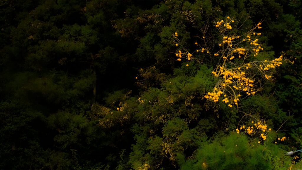 名残の山柿が、ポツンとあった。熟柿となりサルやヒヨドリが食べに来るのを待っている。