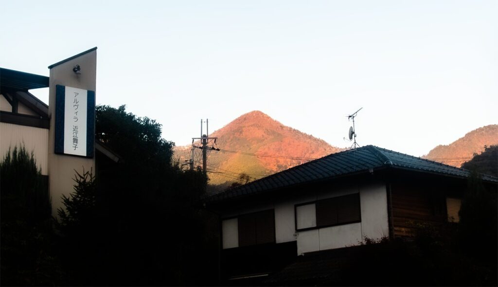 早朝の日が比良山系に射し込み、まだ暗さの残る麓の景色と対象を成していた。