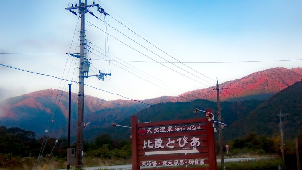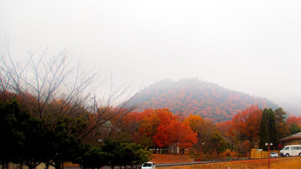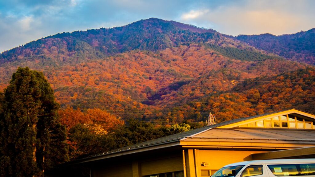 ヒラトピアの向こうの紅葉その上に釈迦岳