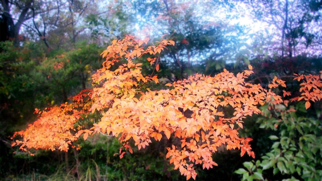 クヌギとその後の黄葉は何だろう。ナナカマド、ハゼ、判らない。