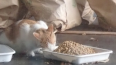 最近よく見るネコさん。カリカリをしっかり食べていく。顔はおかーさんに似ている。牛一家の一員か。まだ、幼さののこるネコさんだ。